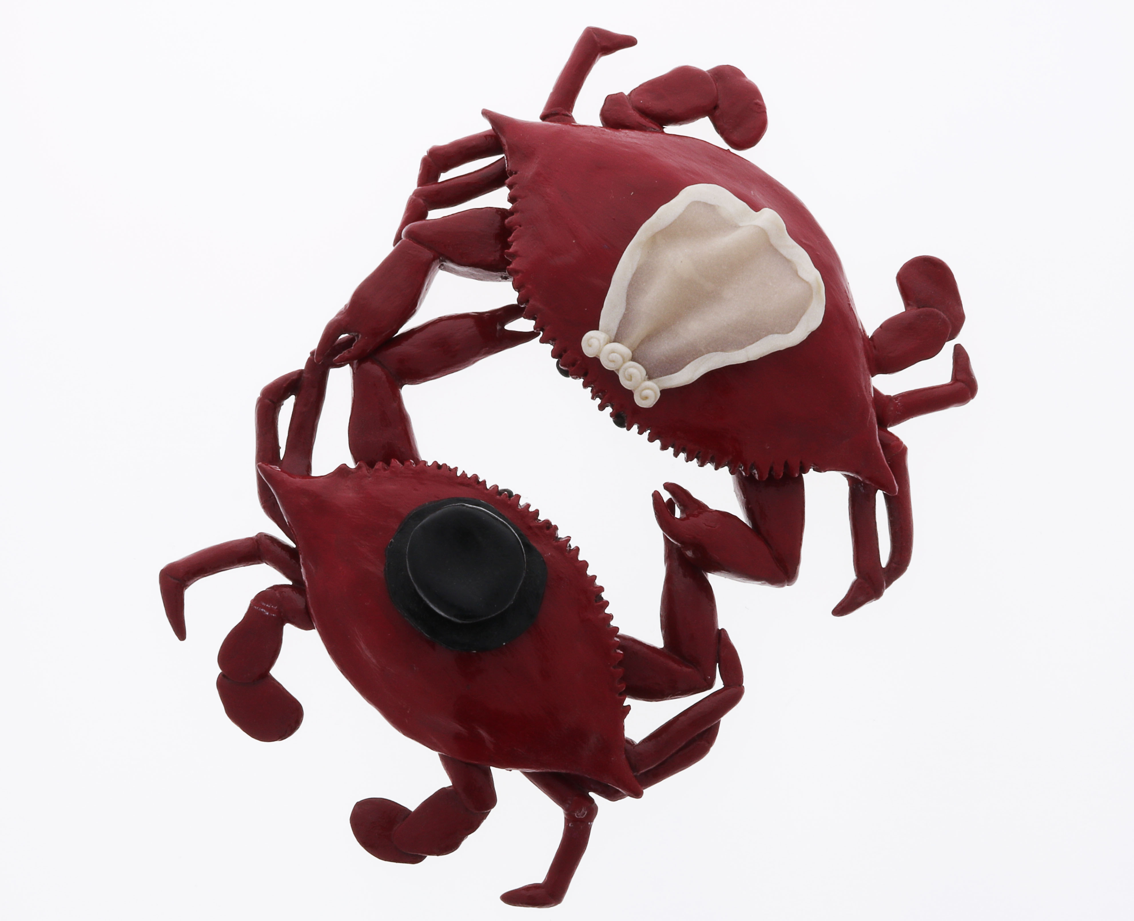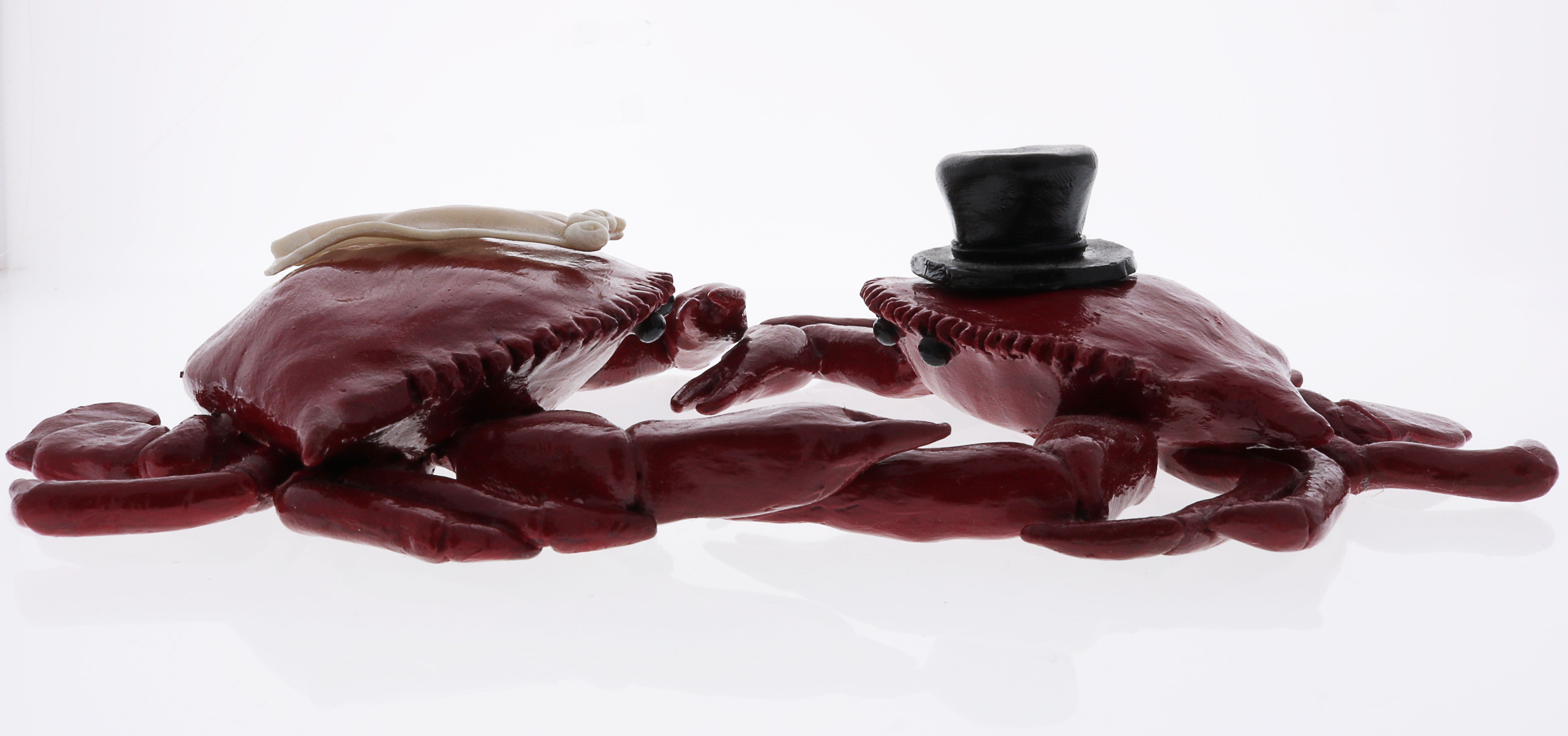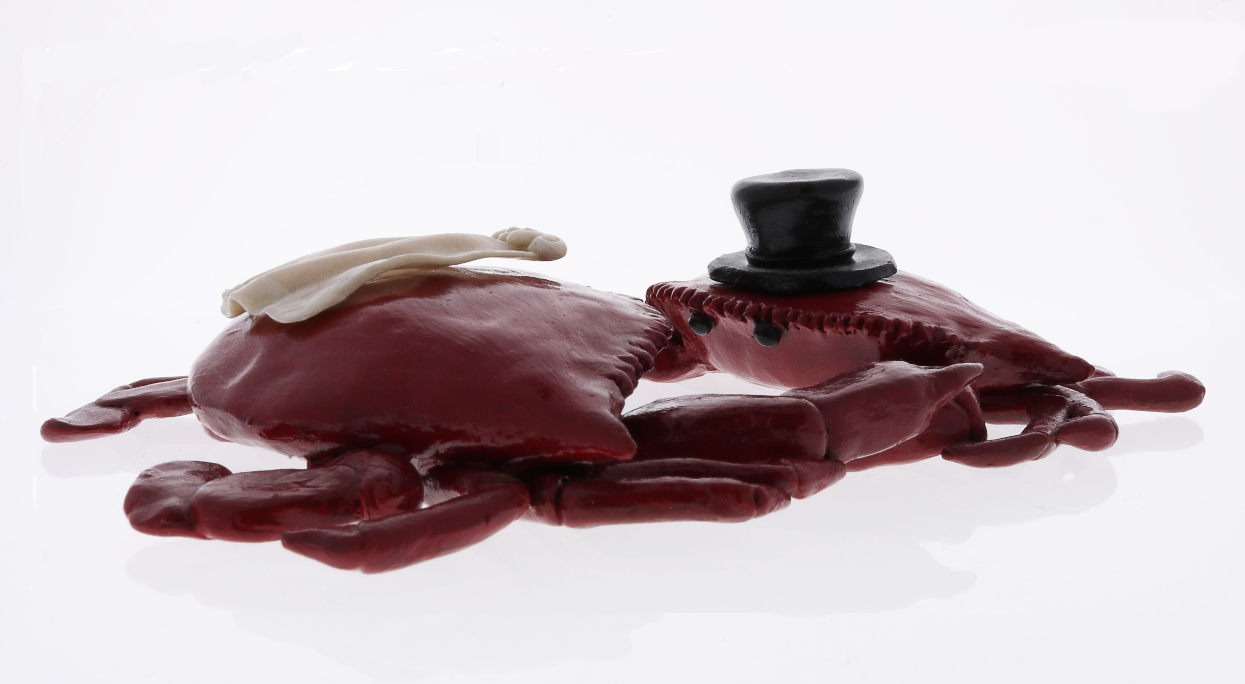 Perfect for a Maryland wedding or just for decoration. This crab topper can be customized to be groom and groom or bride and bride. It is made to fit onto a 8″ cake comfortably. It is about 6.5 inches from back fin to back fine and about 5 inches form point to point.